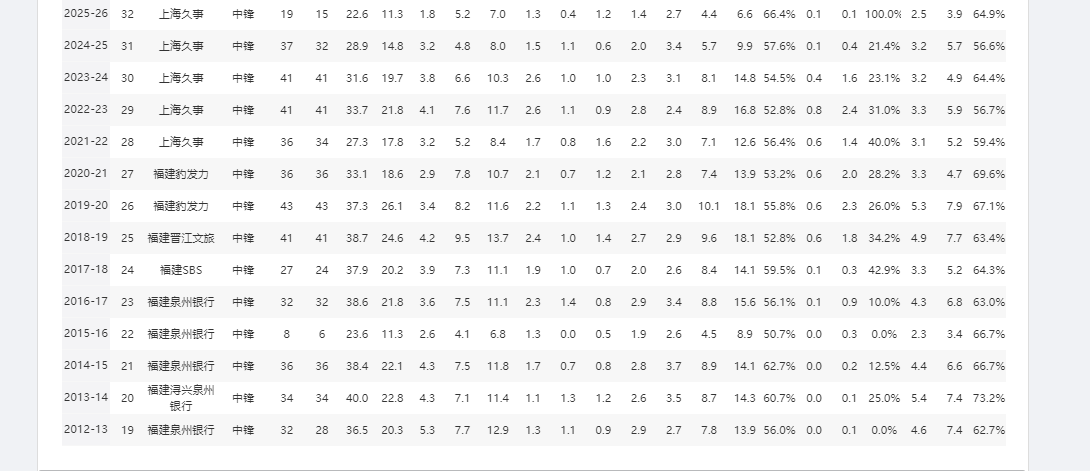 王哲林职业生涯初期出自福建男篮青年队,12-13赛季开始代表福建男篮征战CBA联赛,这也是他CBA生涯的首个赛季。整个赛季下来,当时18岁的王哲林共出战32场常规赛,其中28次首发,场均可出场36.5分钟,出手13.9次,这两项数据,分别位居全队第二高和全队本土第一高,妥妥的球队老大地位。